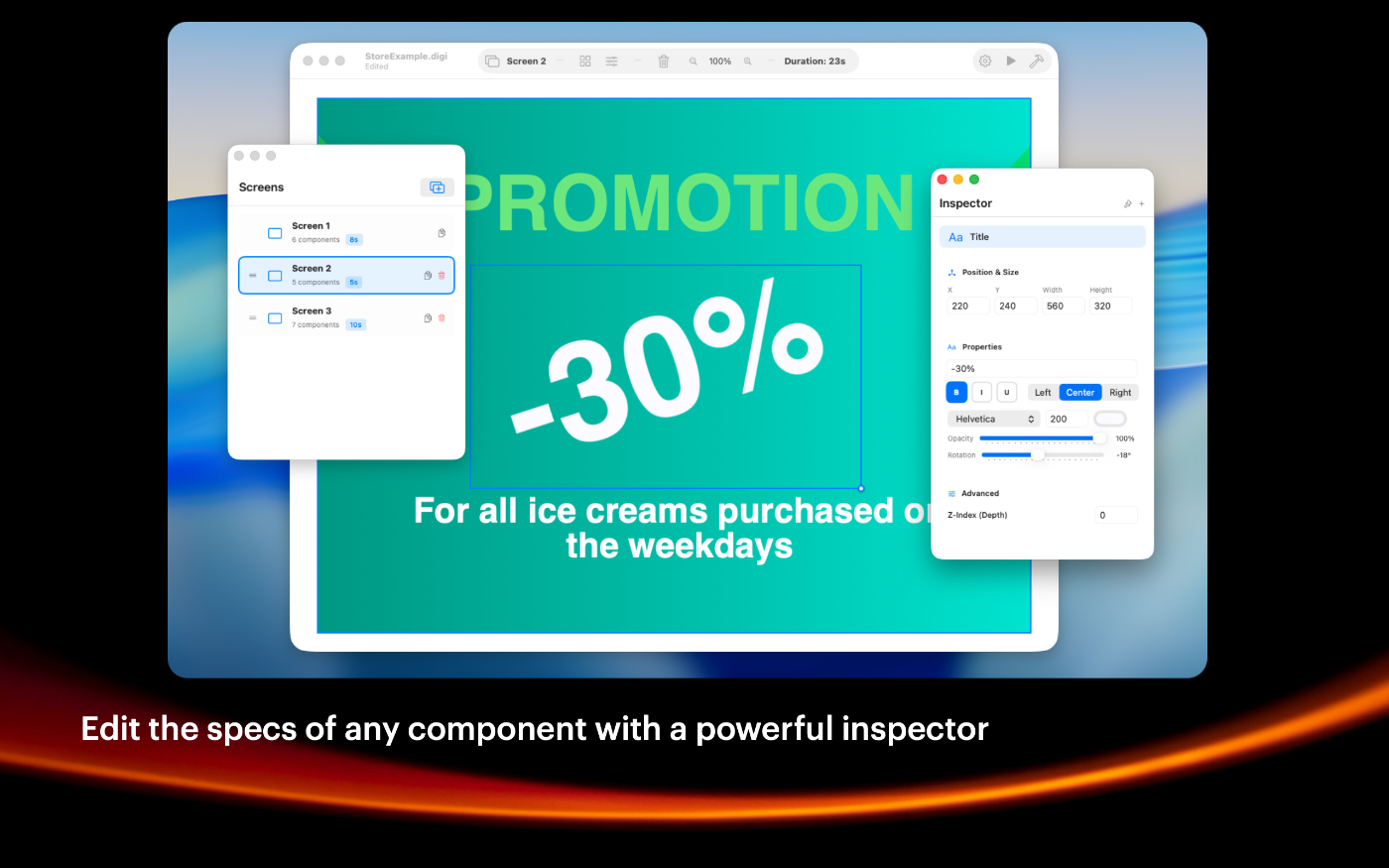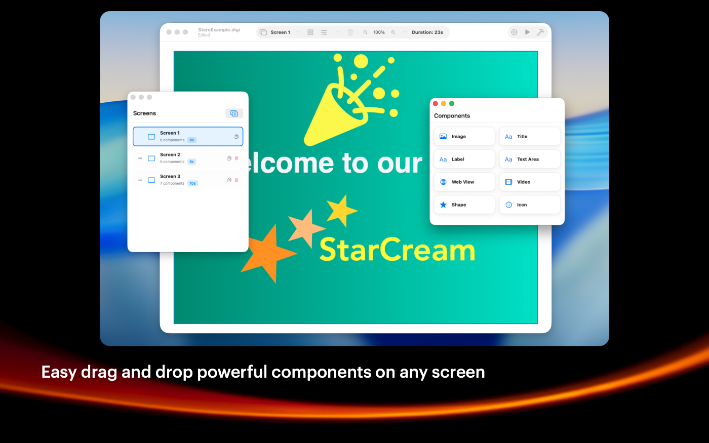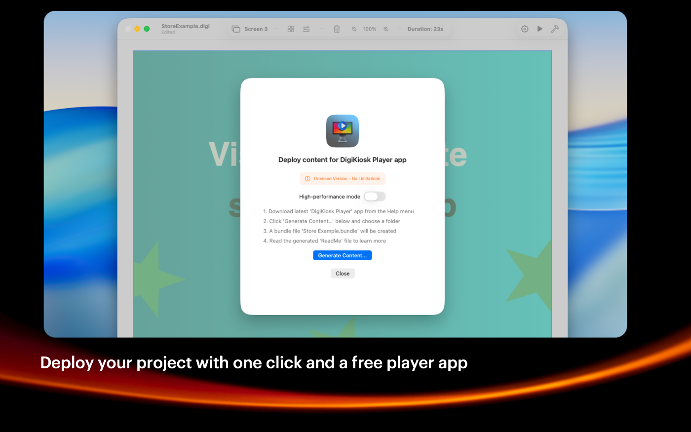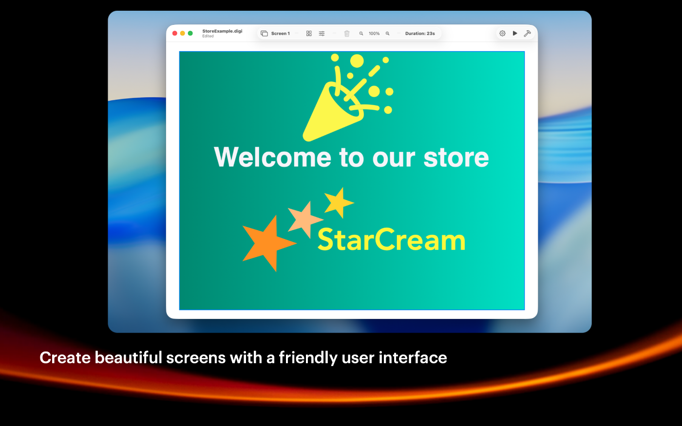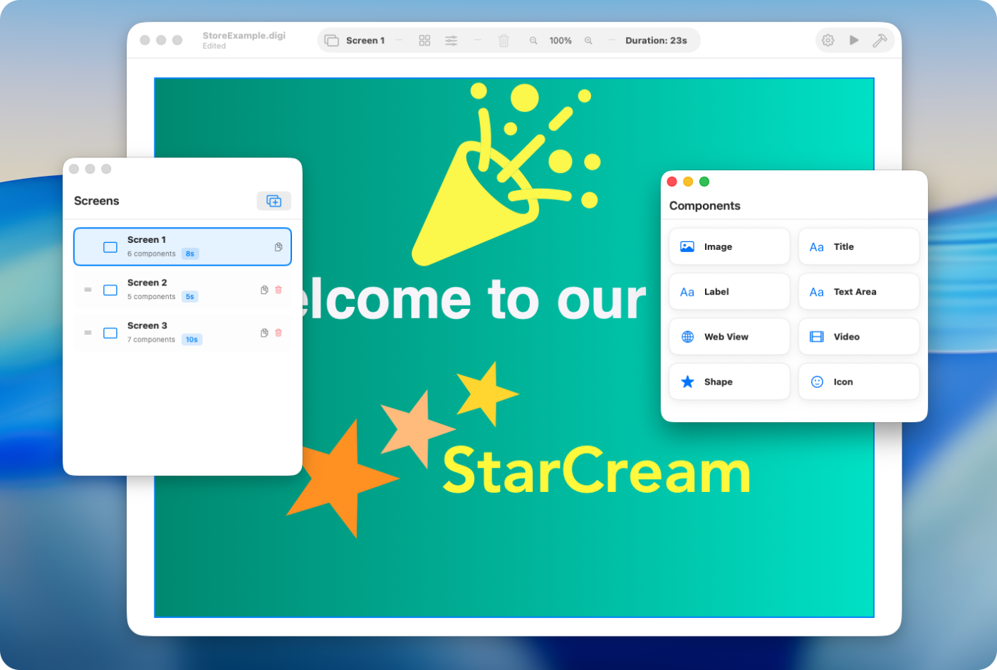 Transform any Mac into a powerful digital signage solution. Design stunning, professional displays for retail stores, restaurants, corporate lobbies, trade shows, or any space that needs dynamic visual content. Engage audiences with impactful digital experiences that capture attention and communicate your message effectively. Whether you need a simple information screen or a complex multimedia presentation, DigiKiosk gives you the tools to deliver professional results—without the complexity. With a rich library of native components—including text, images, videos, icons, and more—you can build fully customized screens tailored to your needs When you are done, deploy your project with a single click. Install the DigiKiosk Player app on as many computers as you like. The player app is only FREE the for Mac platform, automatically detects multiple screens and displays your content across all connected monitors.