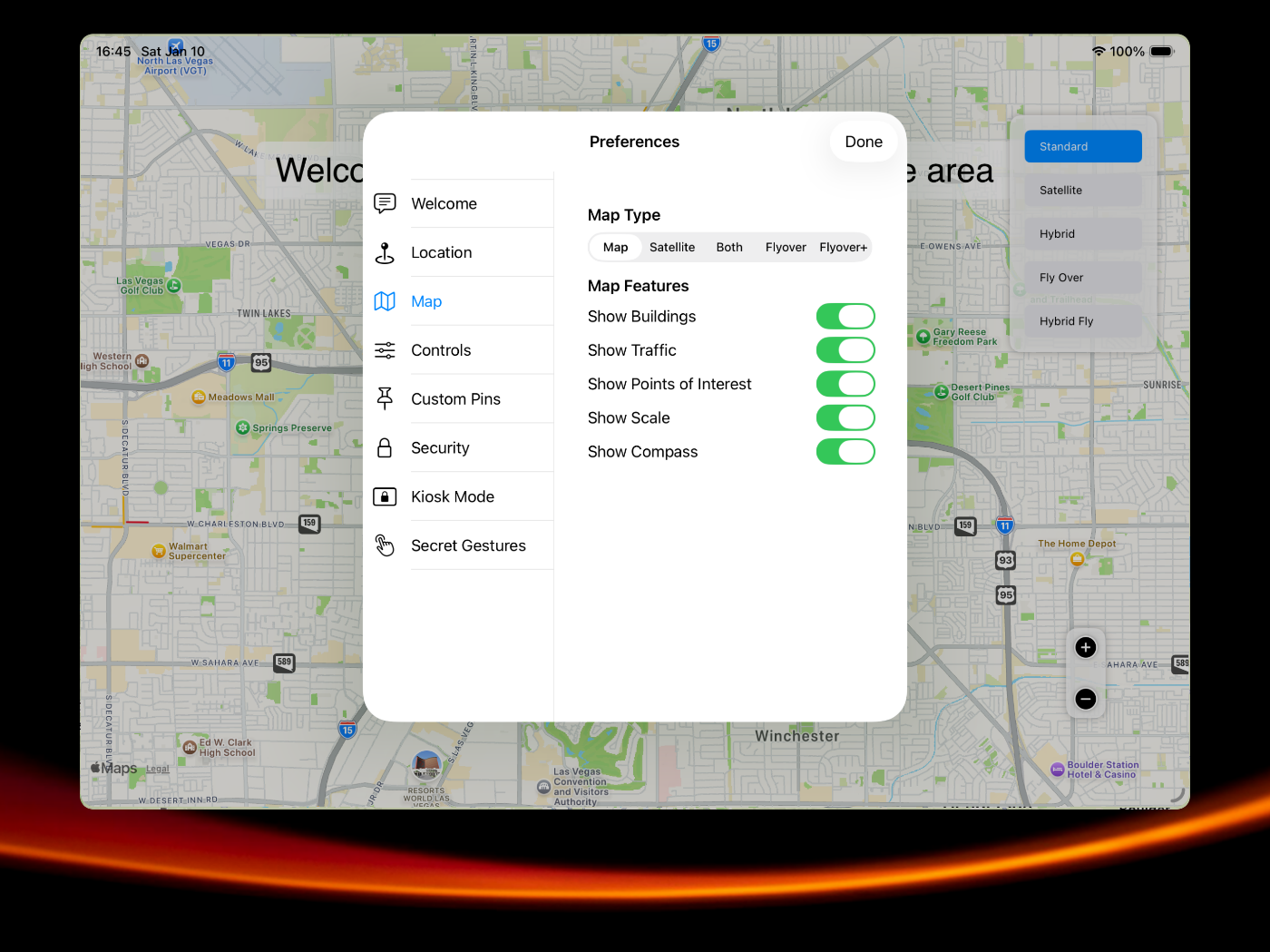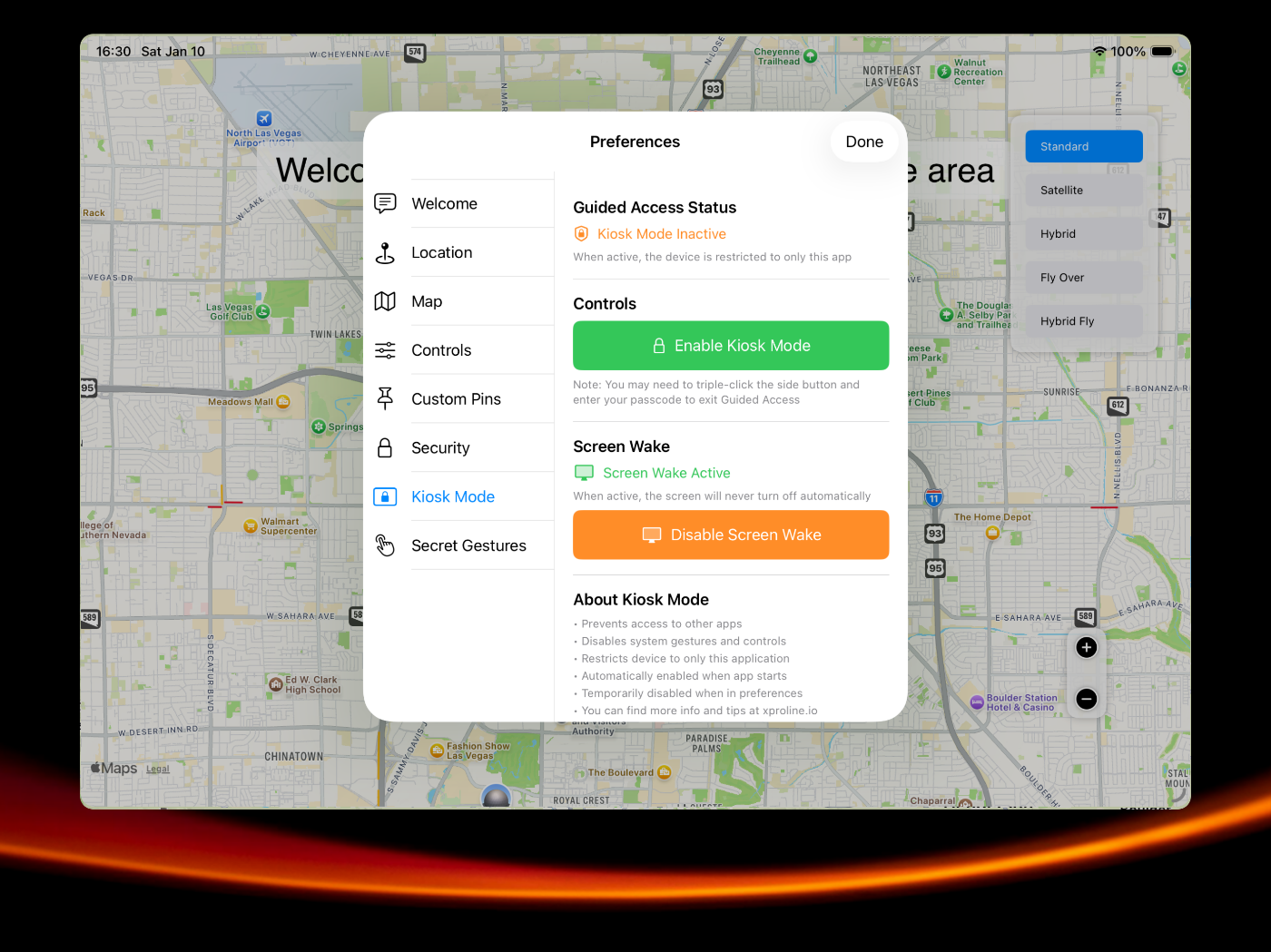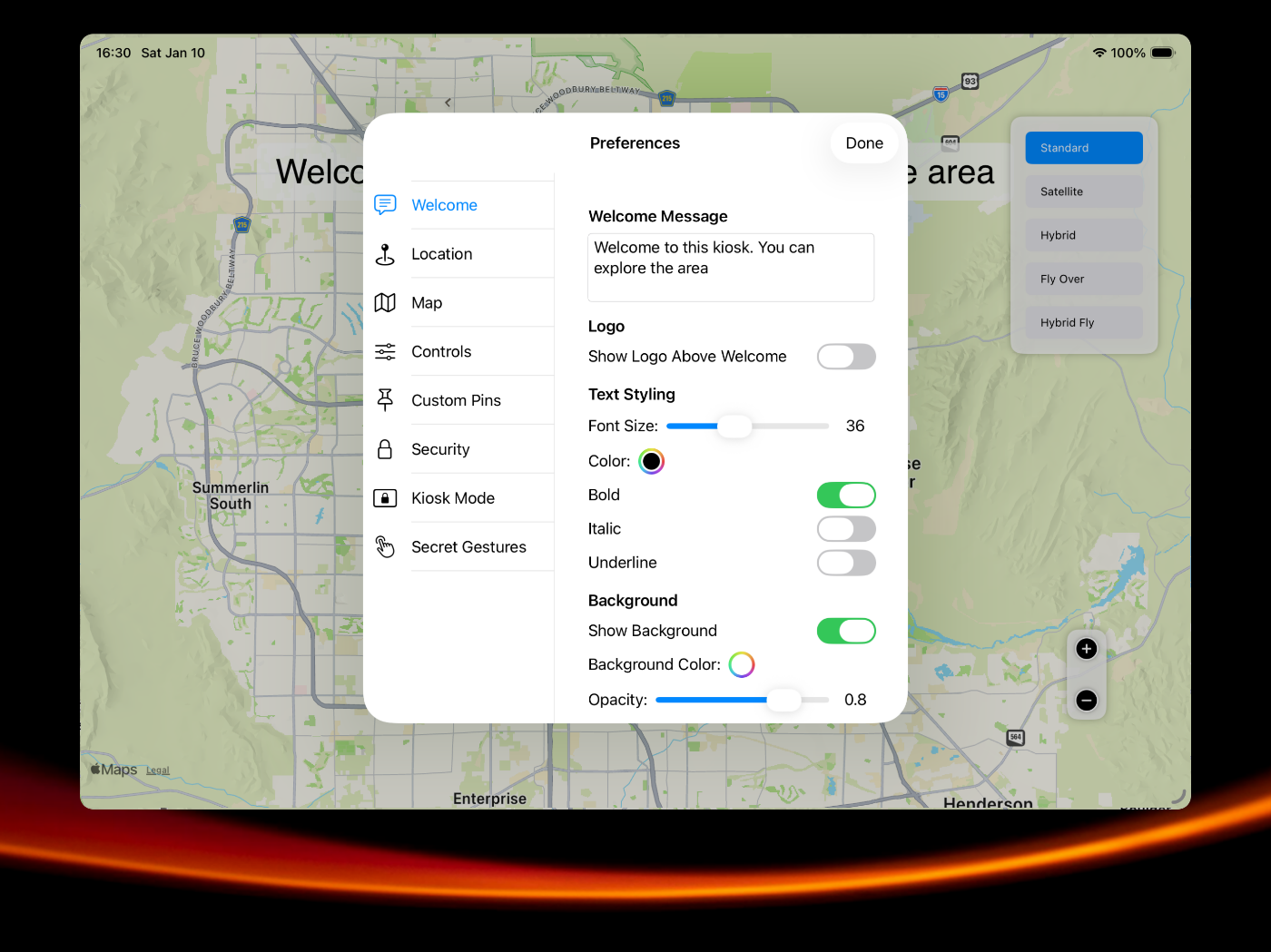 MapKiosk Tablet is a full-screen, and secure app designed for kiosks installed in public spaces like museums, libraries, trade-shows, office lobbies, and more. This app is tailored to provide users with an intuitive and engaging way to explore their surroundings, making it perfect for tourist information centers and retail environments. MapKiosk leverages the full screen of the kiosk to display Apple Maps, providing a rich and detailed view of the area. The high-resolution maps ensure that users can easily navigate and explore with clarity. Users can interact with the map using touchscreen controls, allowing them to zoom in and out, pan around, and tap on pins for more information. Detailed information cards pop up when a pin is selected, providing additional details. Administrators can customize the pins and information displayed based on the kiosk's location and audience. This allows for a tailored experience that meets the specific needs of different environments.