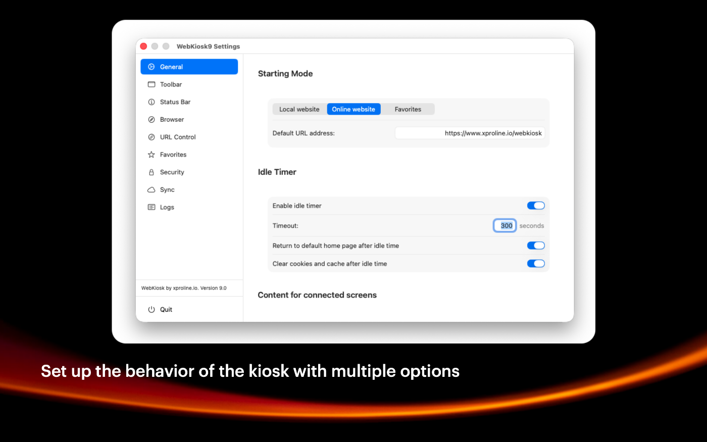 Launch WebKiosk and go to settings. You will find a list of sections on a vertical sidebar.