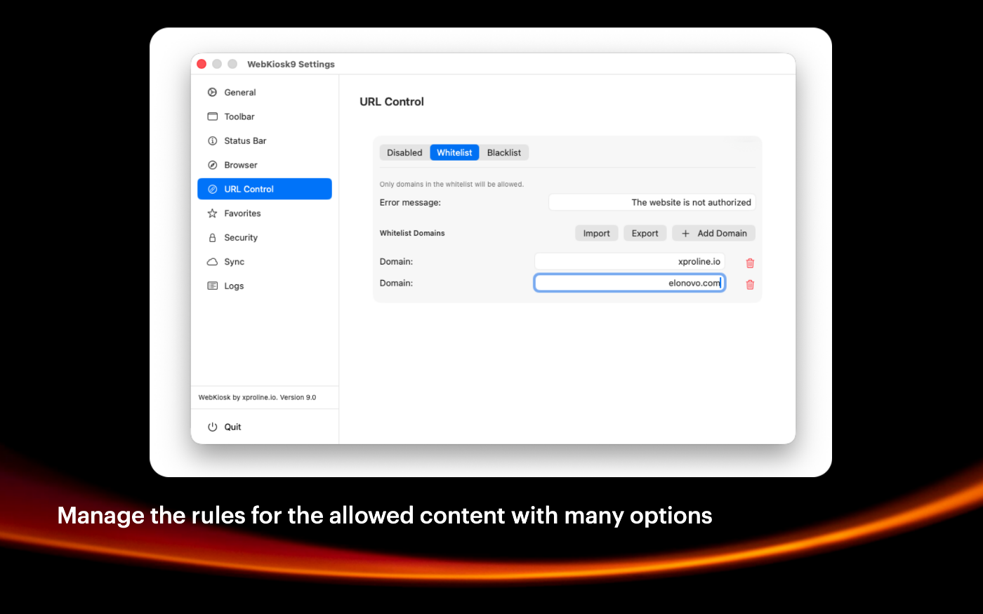 Define the security rules like whitelist, blacklist URLS or the full screen mode with many options.