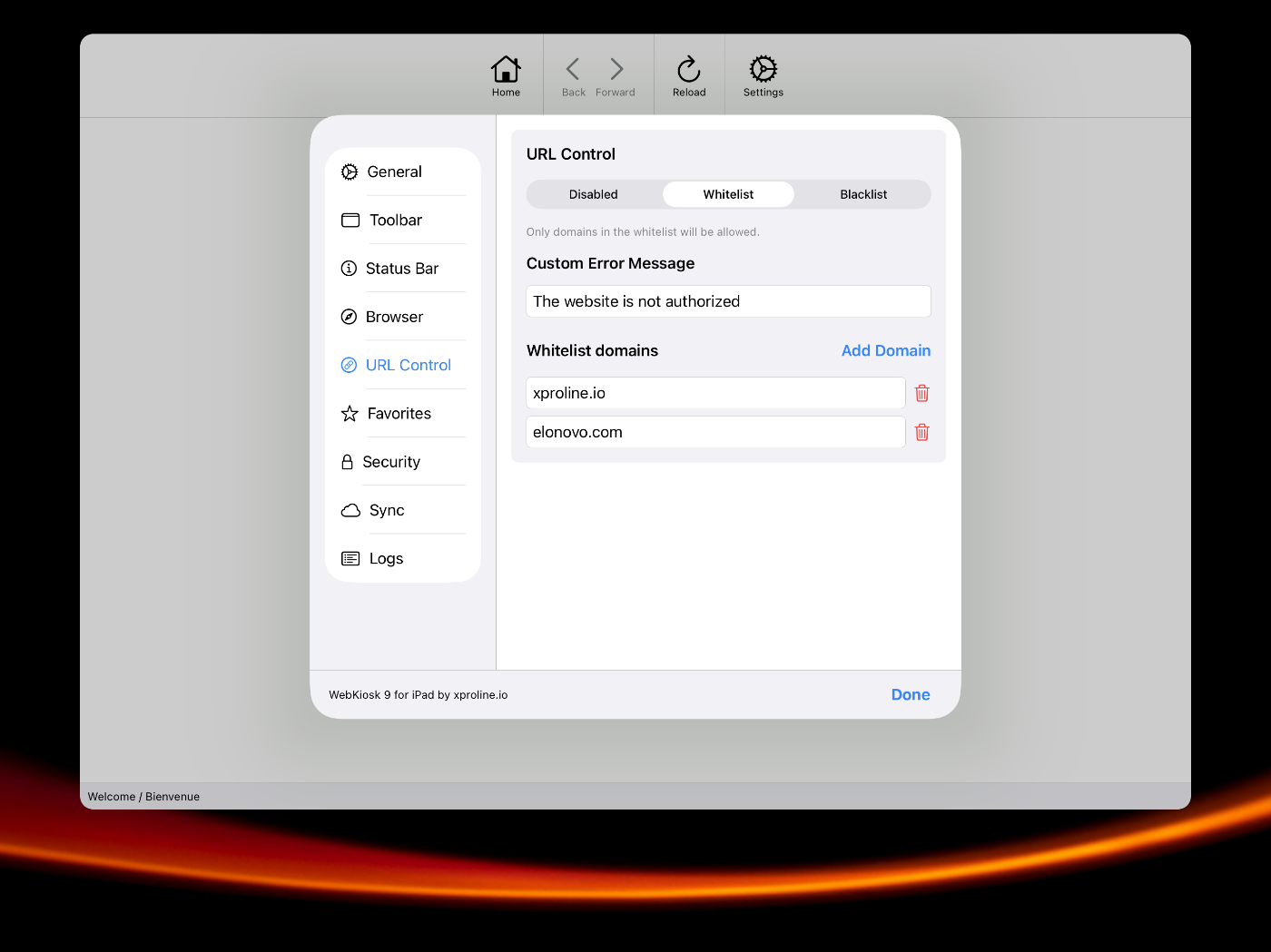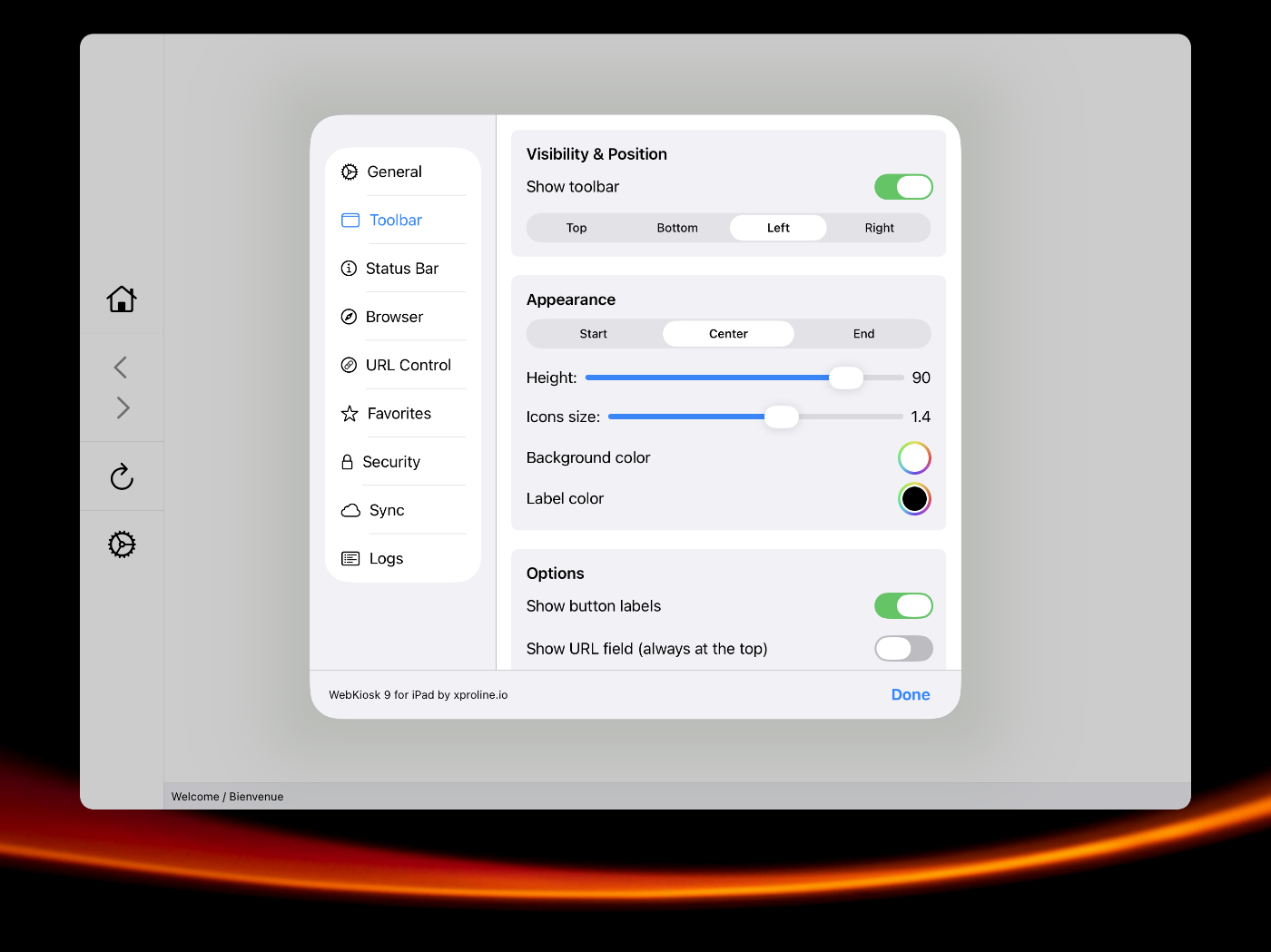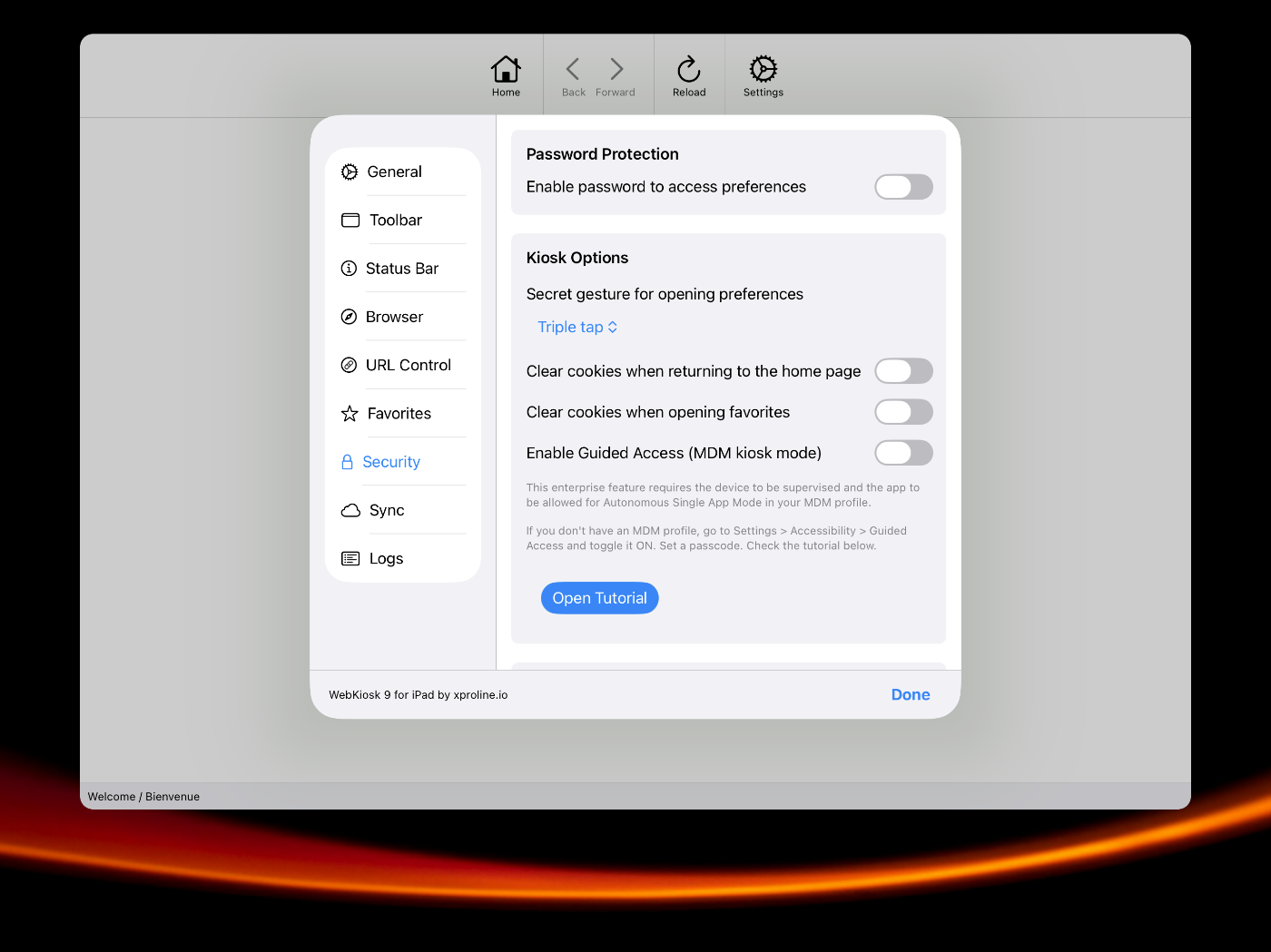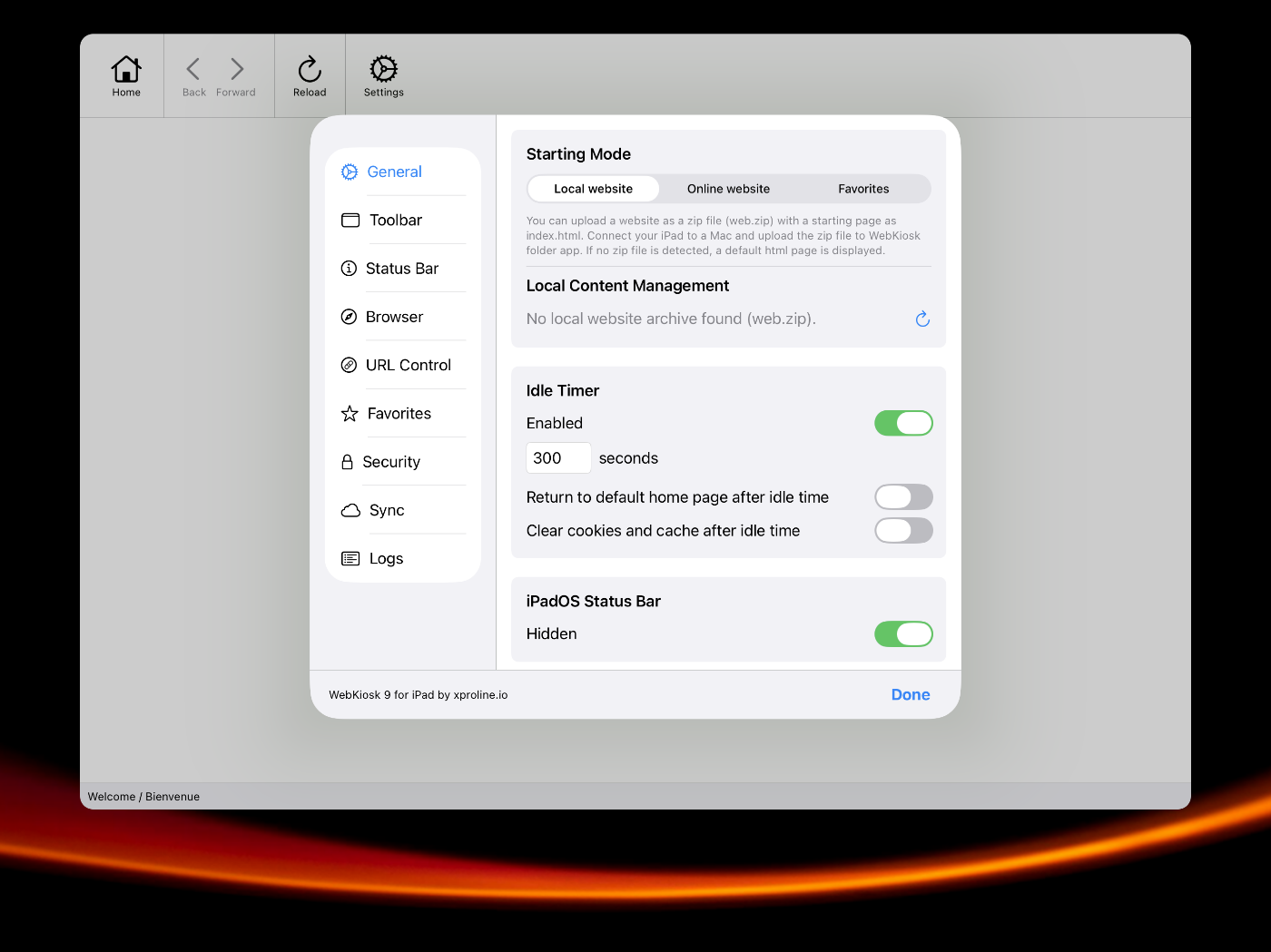 For over a decade, WebKiosk has set the standard as the secure, reliable web browser tailored for public Internet kiosks. Trusted by IT professionals worldwide, it's the ideal solution for spaces like museums, libraries, trade shows, office lobbies, and more. WebKiosk 9 was rebuilt from scratch using Swift language for modern version of macOS and iPadOS. This powerful browser allows you to display online websites or offline local content with ease, ensuring your device stays locked to the specific experience you define. You have complete control over the user interface, with the ability to customize toolbars, adjust colors to match your brand, and hide system distractions for a fully immersive presentation. Built with security in mind, it features advanced URL filtering, password-protected settings, and an idle timer that automatically clears user data and resets the session. With new capabilities like iCloud sync for effortless fleet management and support for camera and microphone access, WebKiosk 9 delivers the reliable, customizable, and secure browsing environment essential for any public-facing display. Version 8 is still available for older versions of iPadOS.